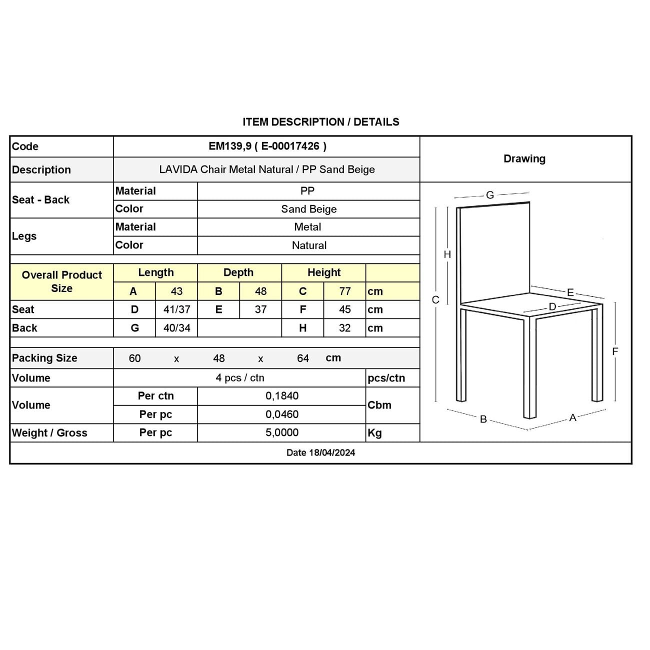 LAVIDA Καρέκλα Τραπεζαρίας Κουζίνας, Μέταλλο Βαφή Φυσικό PP Sand Beige Ε-00017426 ΕΜ139,9 (ΣΕΤ ΤΩΝ 4)