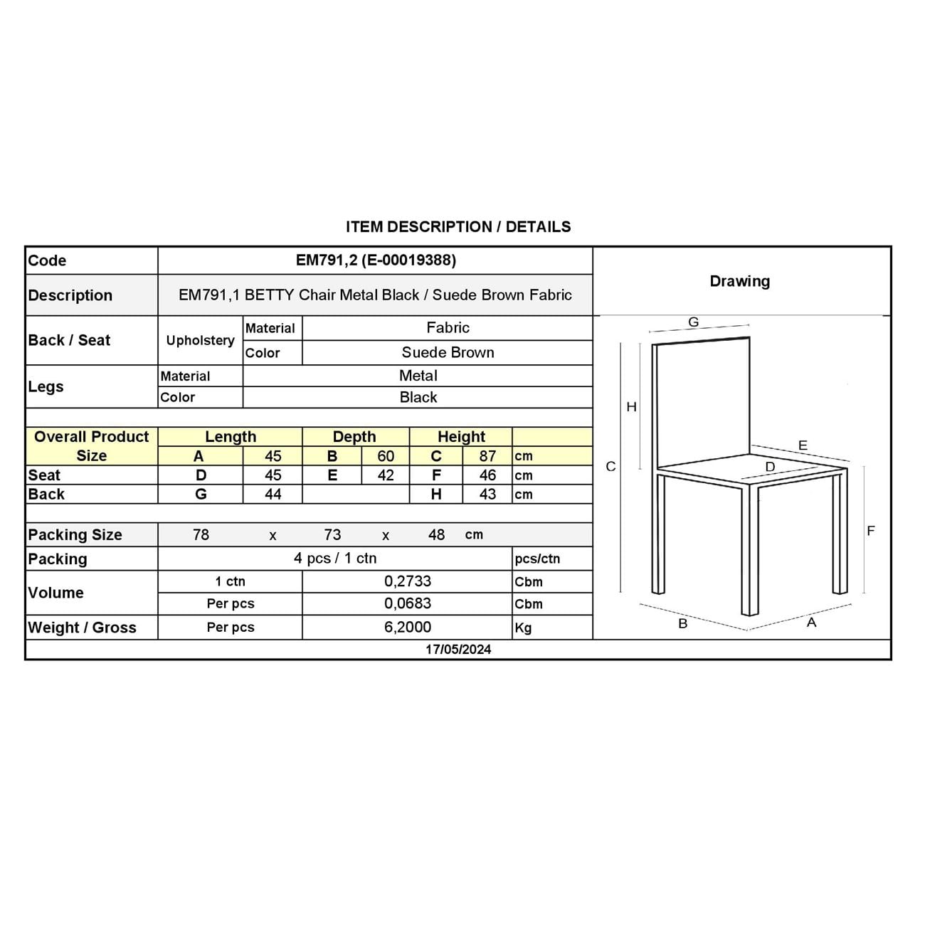 BETTY Καρέκλα Μέταλλο Βαφή Μαύρο, Ύφασμα Suede Καφέ Ε-00019388 ΕΜ791,2 (ΣΕΤ ΤΩΝ 4)