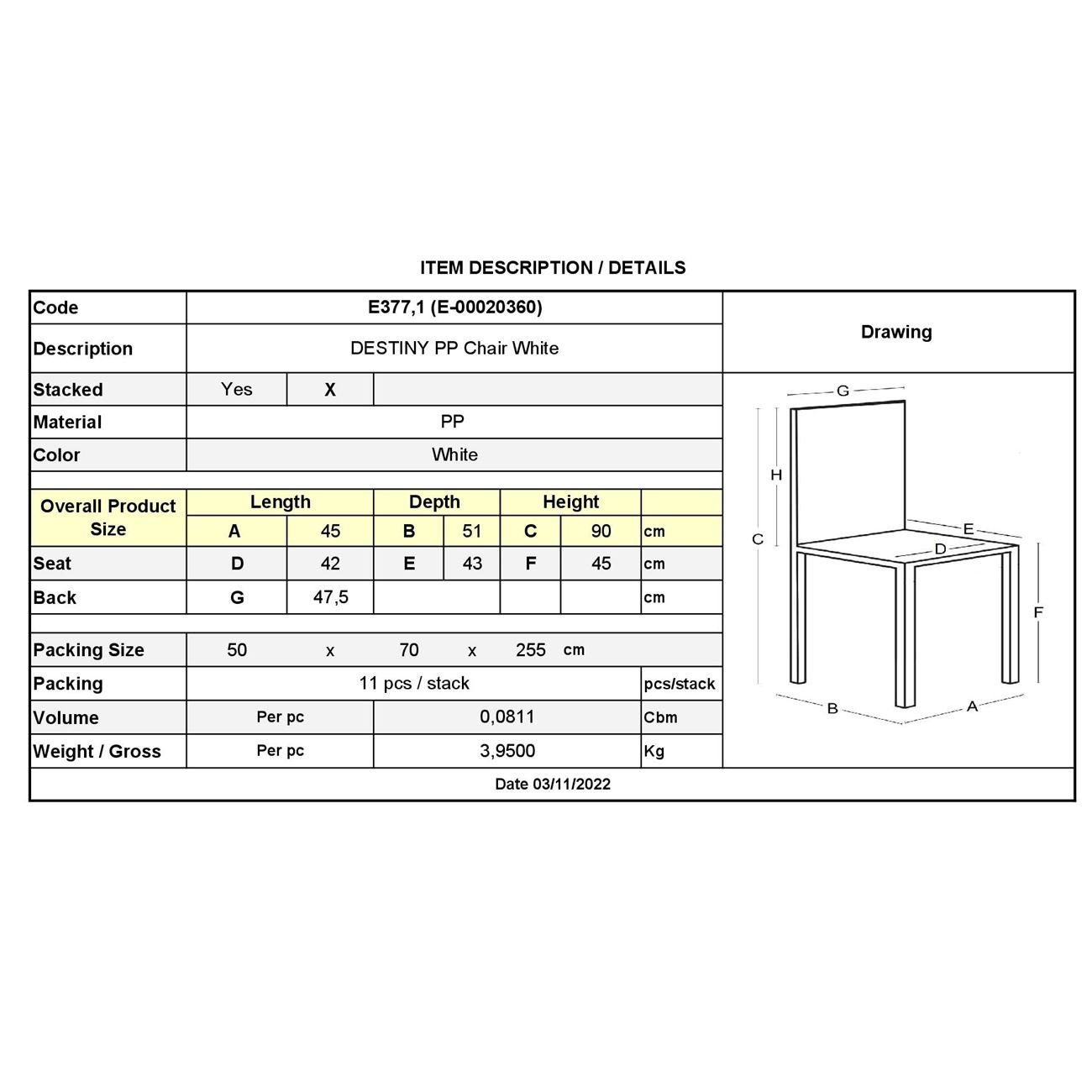 DESTINY Καρέκλα Πολυπροπυλένιο (PP), Απόχρωση Άσπρο, Στοιβαζόμενη Ε-00020360 Ε377,1