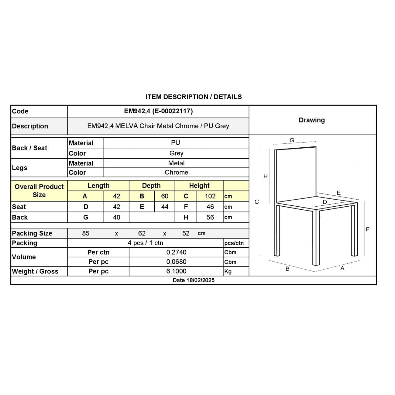 MELVA Καρέκλα Tραπεζαρίας Κουζίνας, Μέταλλο Χρώμιο, PU Γκρι Ε-00022117 ΕΜ942,4 (ΣΕΤ ΤΩΝ 4)