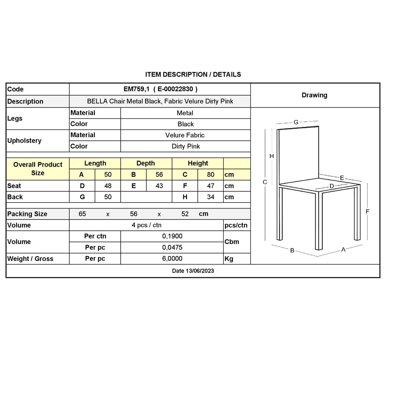 BELLA Καρέκλα Τραπεζαρίας, Μέταλλο Βαφή Μαύρο, Ύφασμα Velure Απόχρωση Dirty Pink Ε-00022830 ΕΜ759,1 (ΣΕΤ ΤΩΝ 4)