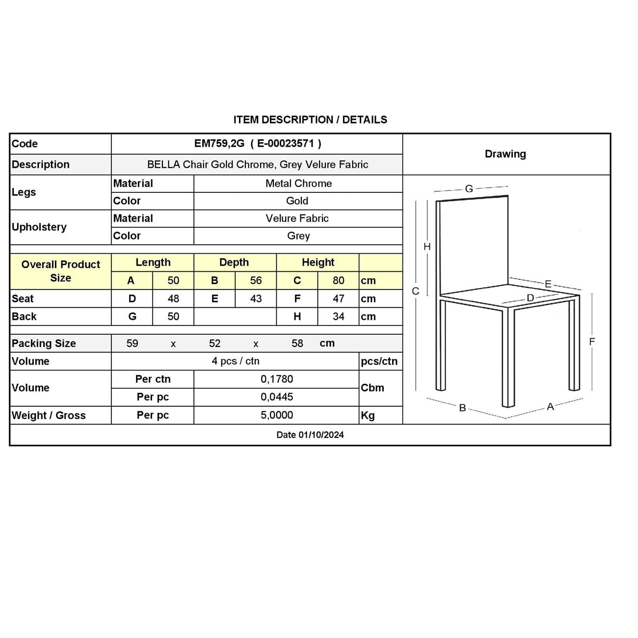 BELLA Καρέκλα Τραπεζαρίας, Μέταλλο Χρώμιο Χρυσό, Ύφασμα Velure Απόχρωση Γκρι Ε-00023571 ΕΜ759,2G (ΣΕΤ ΤΩΝ 4)