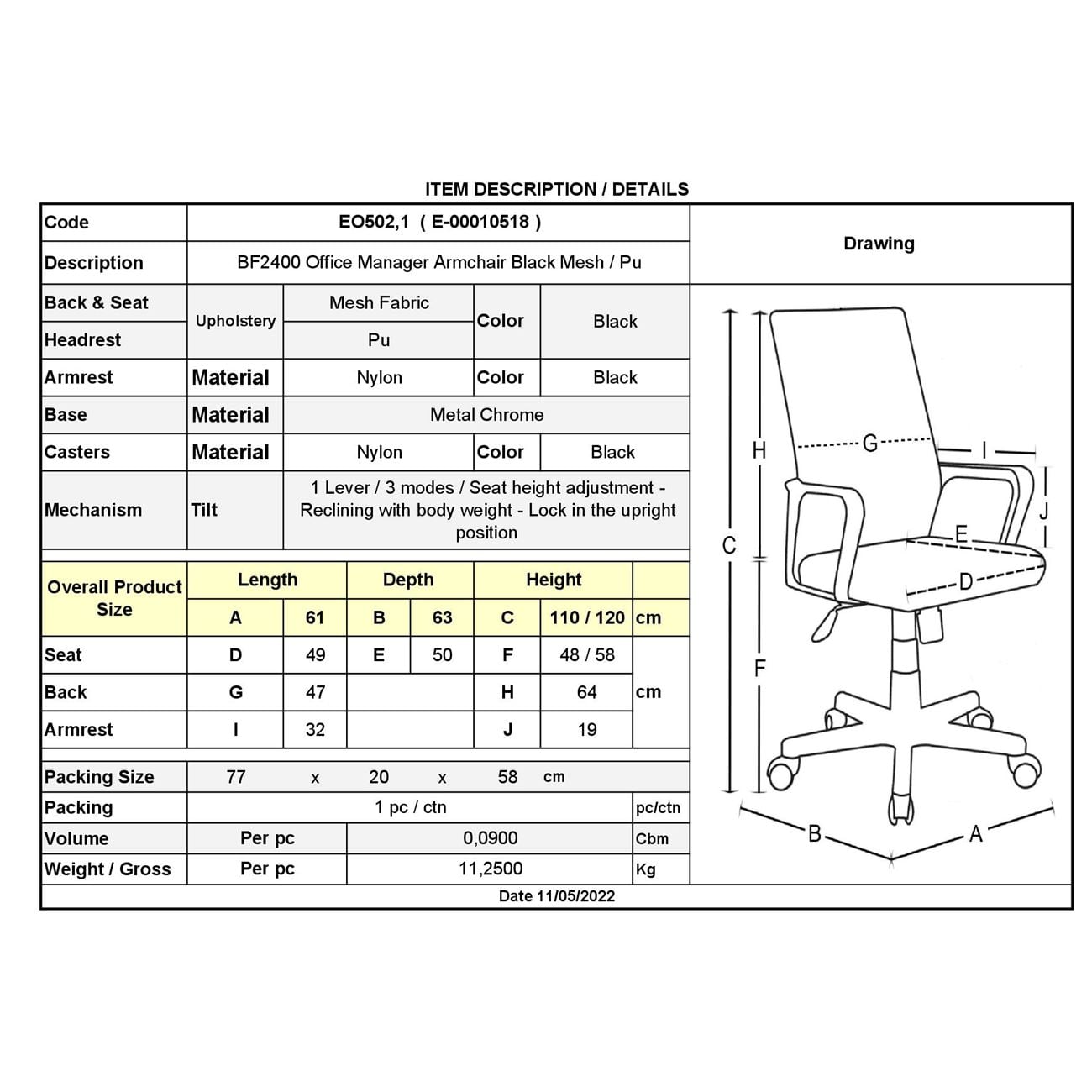 BF2400 Πολυθρόνα Γραφείου Διευθυντή, Βάση Χρώμιο, Pu Μαύρο, Mesh Μαύρο Ε-00010518 ΕΟ502,1