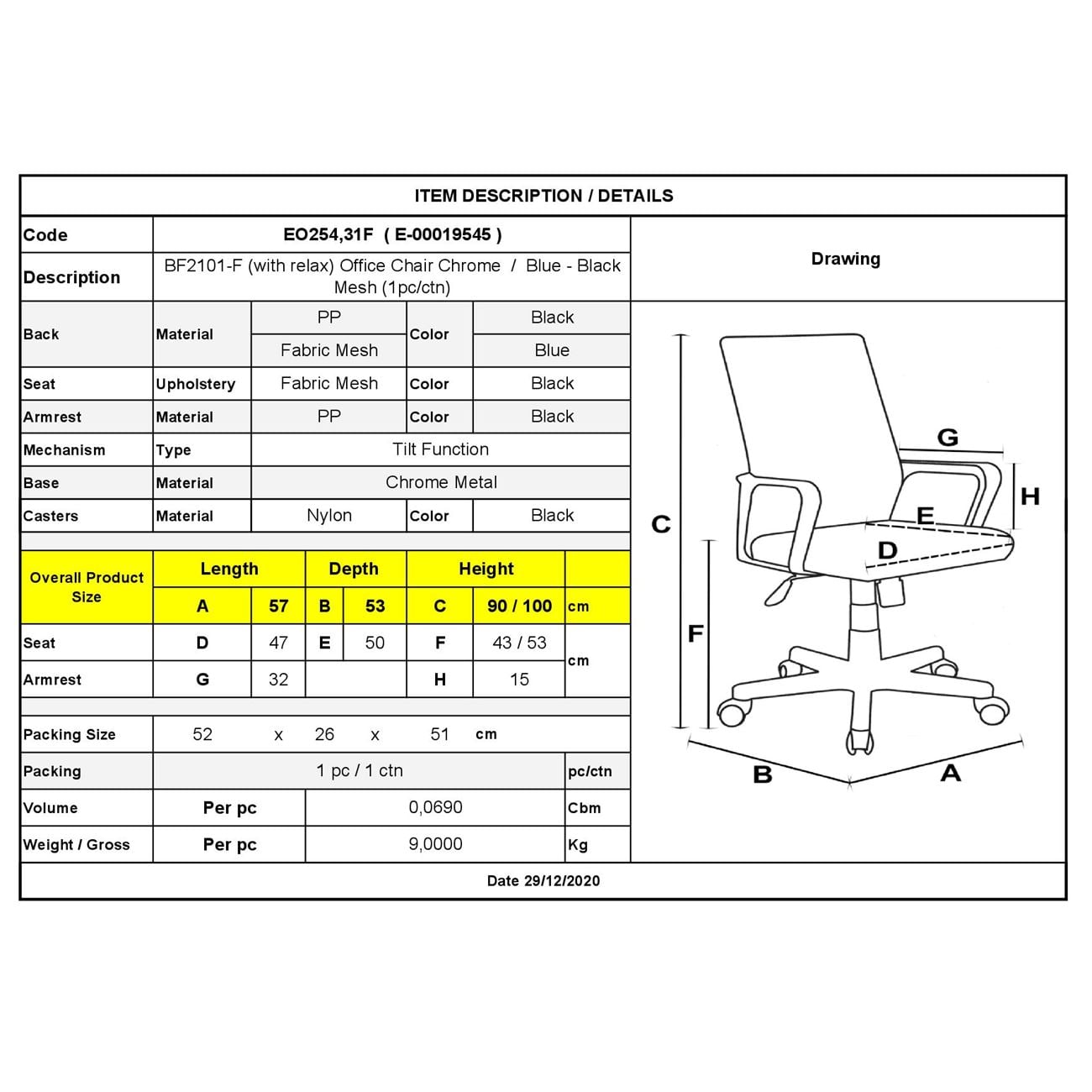 BF2101-F Πολυθρόνα Γραφείου με Aνάκλιση, Μέταλλο Χρώμιο Mesh Μπλε - Μαύρο Ε-00019545 ΕΟ254,31F