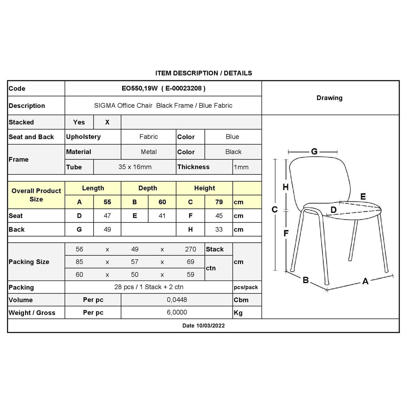 SIGMA Καρέκλα Στοιβαζόμενη Γραφείου Επισκέπτη, Μέταλλο Βαφή Μαύρο, Ύφασμα Μπλε Ε-00023208 ΕΟ550,19W