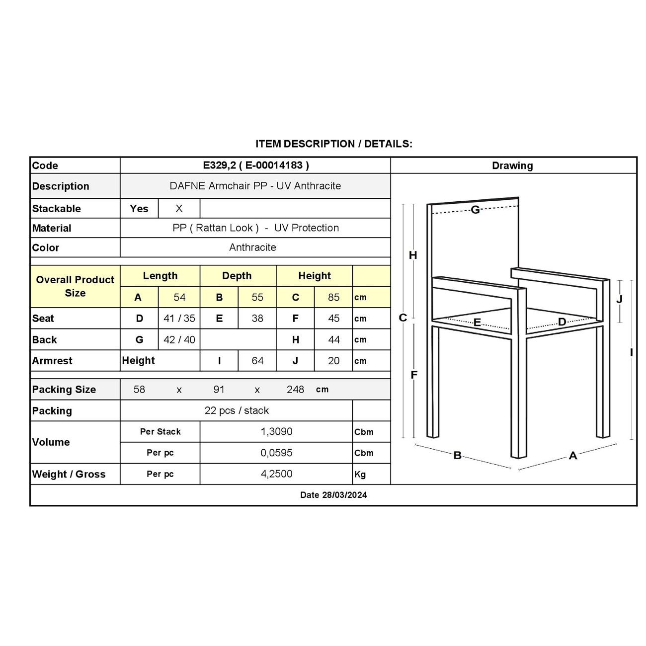DAFNE Πολυθρόνα Τραπεζαρίας Κήπου Στοιβαζόμενη, PP Rattan Look UV Protection, Ανθρακί Ε-00014183 Ε329,2
