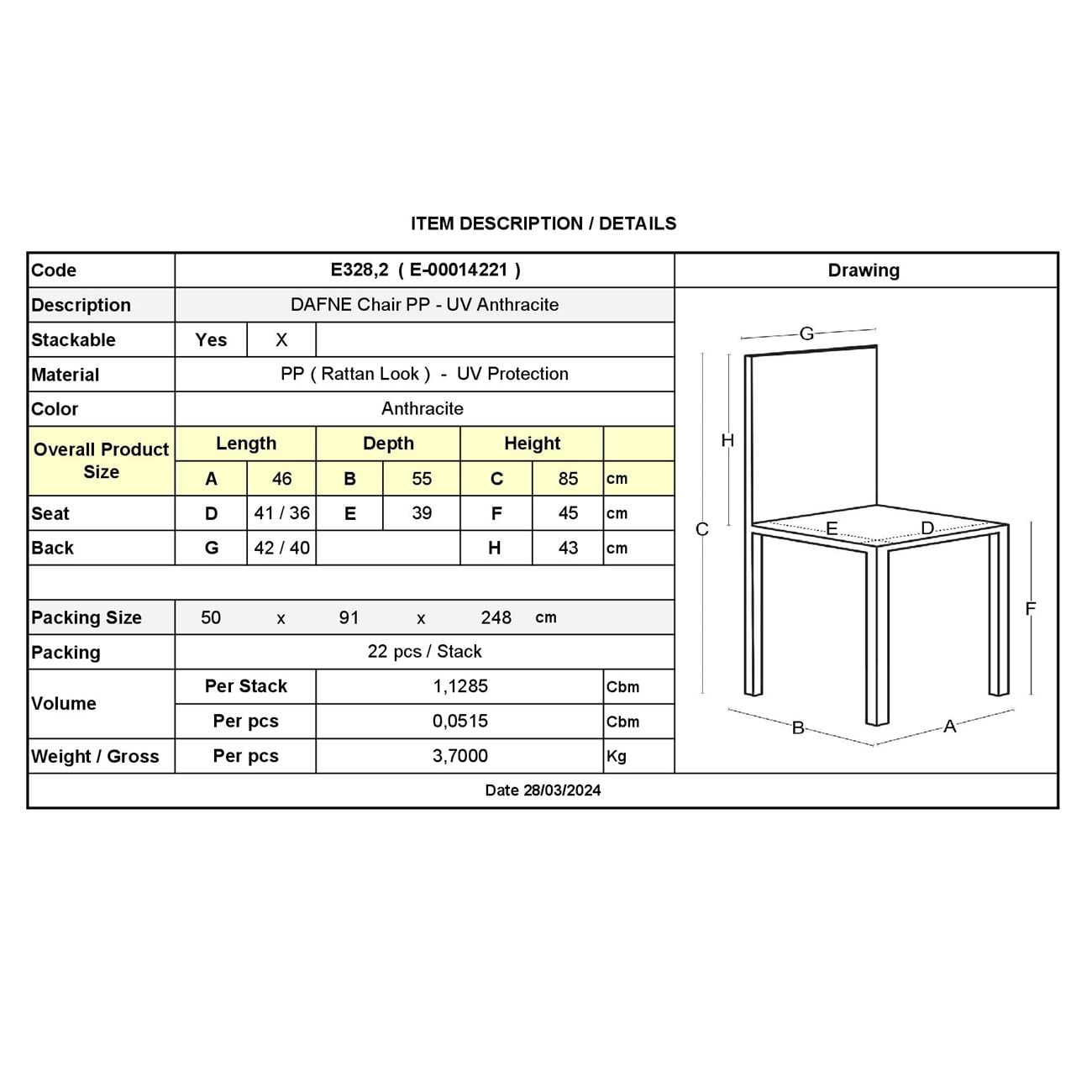 DAFNE Καρέκλα Τραπεζαρίας Κήπου Στοιβαζόμενη, PP Rattan Look UV Protection, Ανθρακί Ε-00014221 Ε328,2