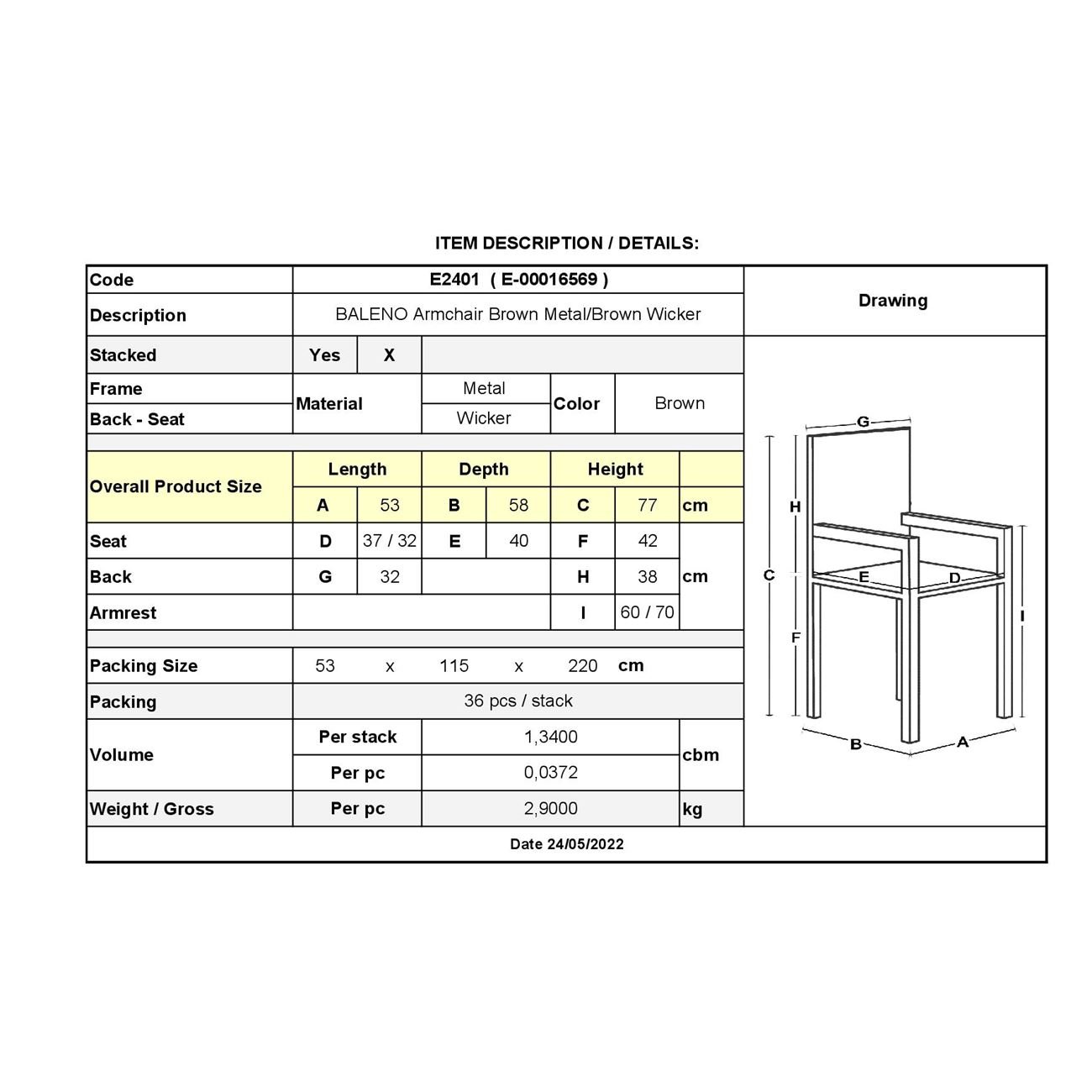 BALENO Πολυθρόνα Βεράντας - Κήπου, Μέταλλο Βαφή Καφέ, Wicker Brown, Στοιβαζόμενη Ε-00016569 Ε2401