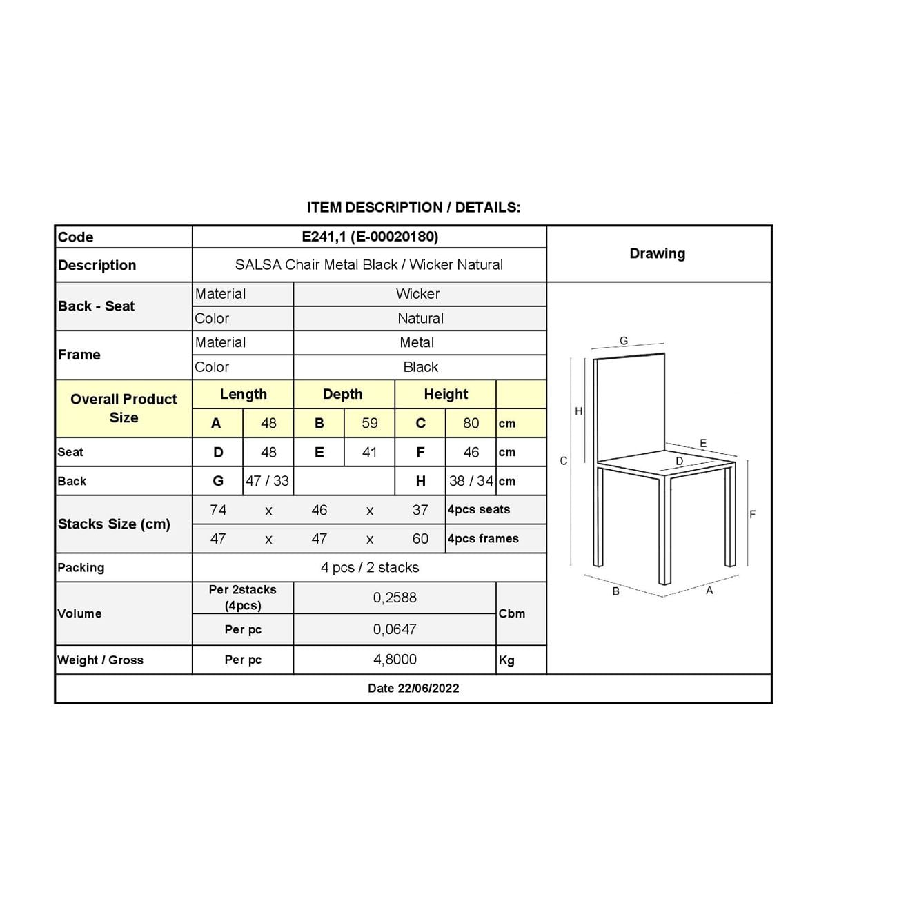 SALSA Καρέκλα Κήπου Βεράντας Μέταλλο Βαφή Μαύρο, Wicker Φυσικό Ε-00020180 Ε241,1