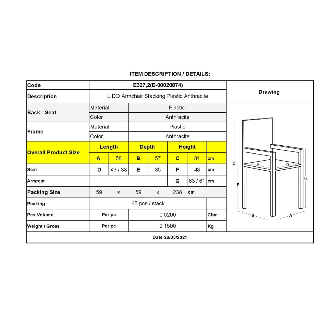 LIDO Πολυθρόνα Τραπεζαρίας Κήπου - Βεράντας Στοιβαζόμενη, PP Απόχρωση Ανθρακί Ε-00020874 Ε327,2