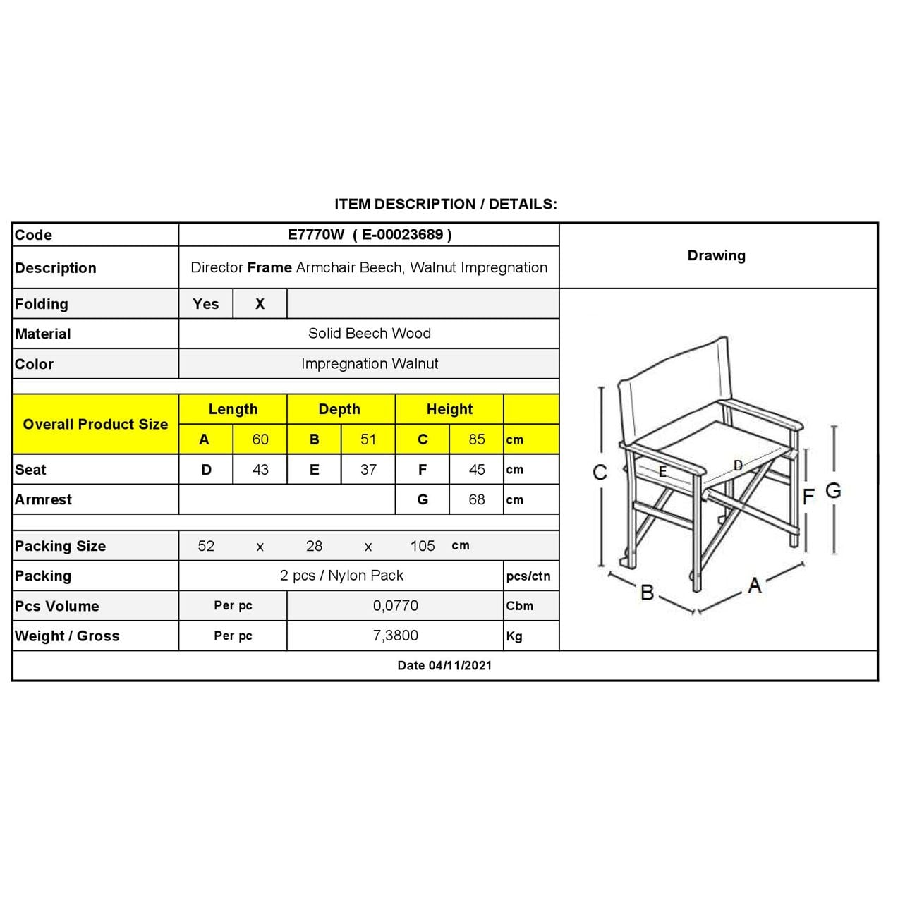Σκηνοθέτη Σκελετός Πολυθρόνας Οξιά, Βαφή Εμποτισμού Απόχρωση Καρυδί, Πτυσσόμενη Ε-00023689 Ε7770W