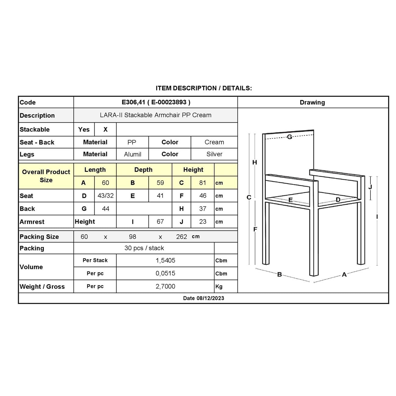 LARA-II Πολυθρόνα Dining Στοιβαζόμενη, ALU Silver, PP Εκρού Ε-00023893 Ε306,41