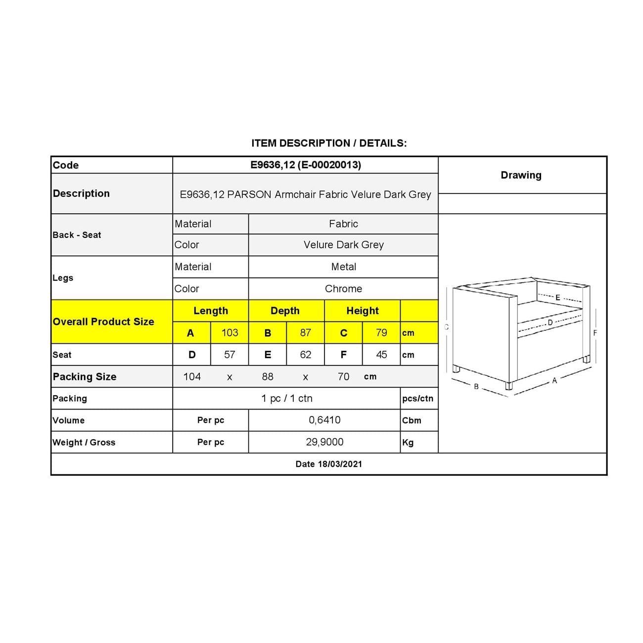 PARSON Πολυθρόνα Σαλονιού - Καθιστικού, Ύφασμα Velure Απόχρωση Σκούρο Γκρι Ε-00020013 Ε9636,12