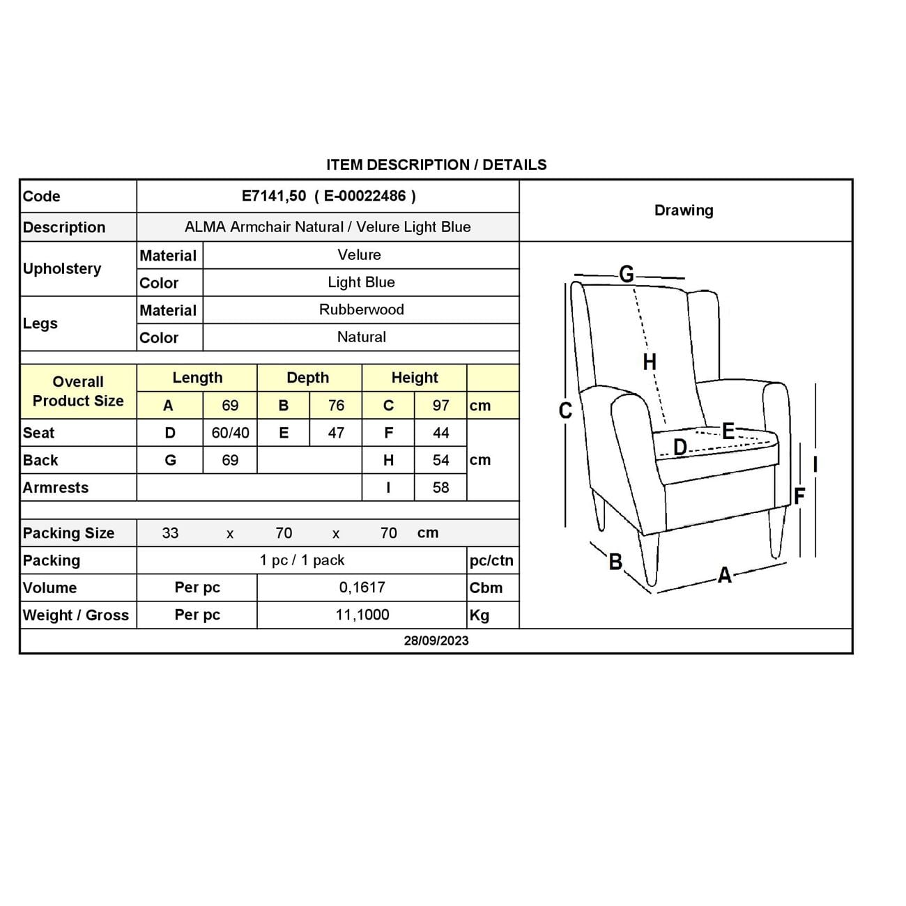 ALMA Πολυθρόνα - Μπερζέρα Σαλονιού - Καθιστικού Φυσικό Ύφασμα Ανοιχτό Μπλε Velure,K/D Ε-00022486 Ε7141,50
