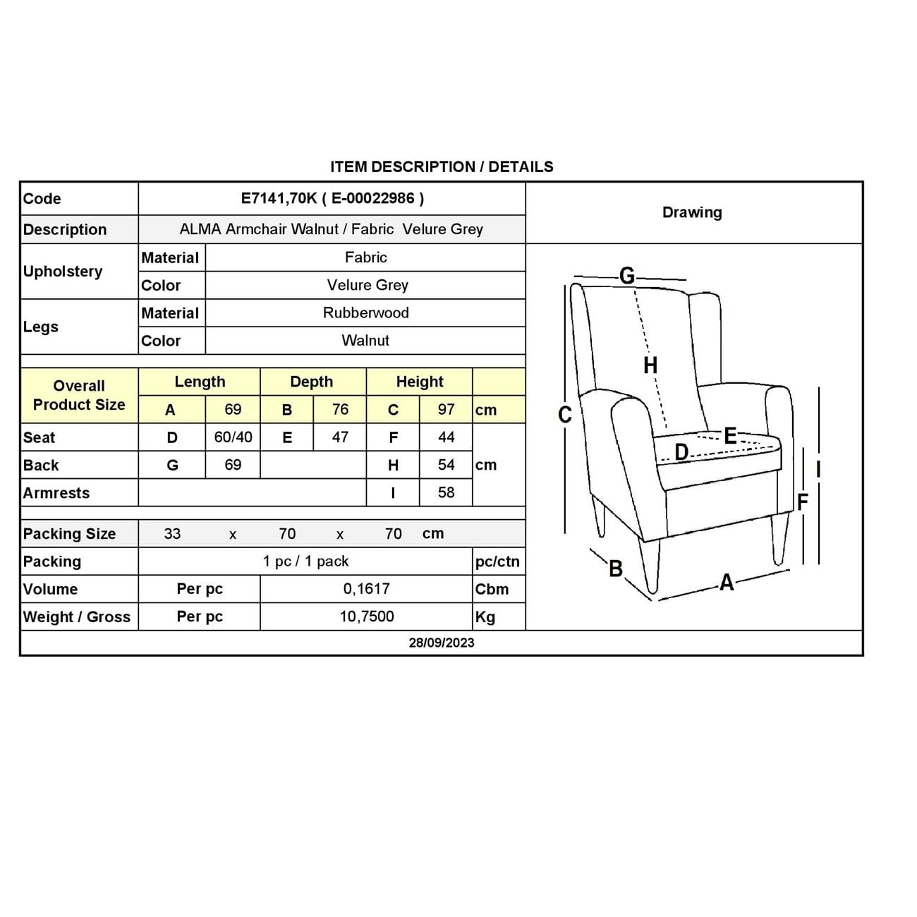 ALMA Πολυθρόνα - Μπερζέρα Σαλονιού - Καθιστικού Καρυδί Ύφασμα Γκρι Velure, K/D Ε-00022986 Ε7141,70Κ