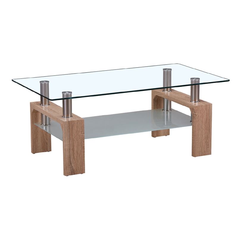 Τραπεζάκι σαλονιού γυάλινο, με ράφι και πόδια σε απόχρωση Sonoma.