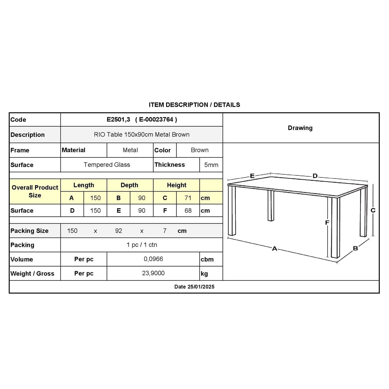 RIO Τραπέζι Κήπου - Βεράντας, Μέταλλο Βαφή Καφέ, Γυαλί Ε-00023764 Ε2501,3