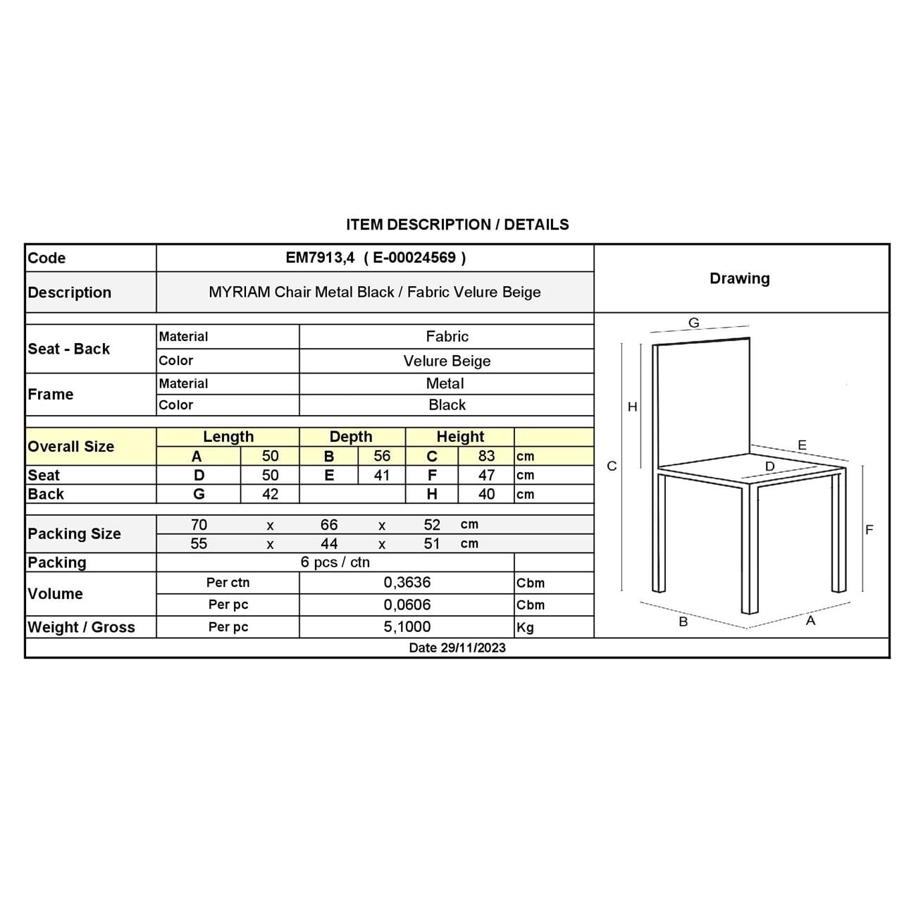 MYRIAM Καρέκλα Τραπεζαρίας, Μέταλλο Βαφή Μαύρο, Ύφασμα Velure Απόχρωση Μπεζ Ε-00024569 ΕΜ7913,4 (ΣΕΤ ΤΩΝ 6)
