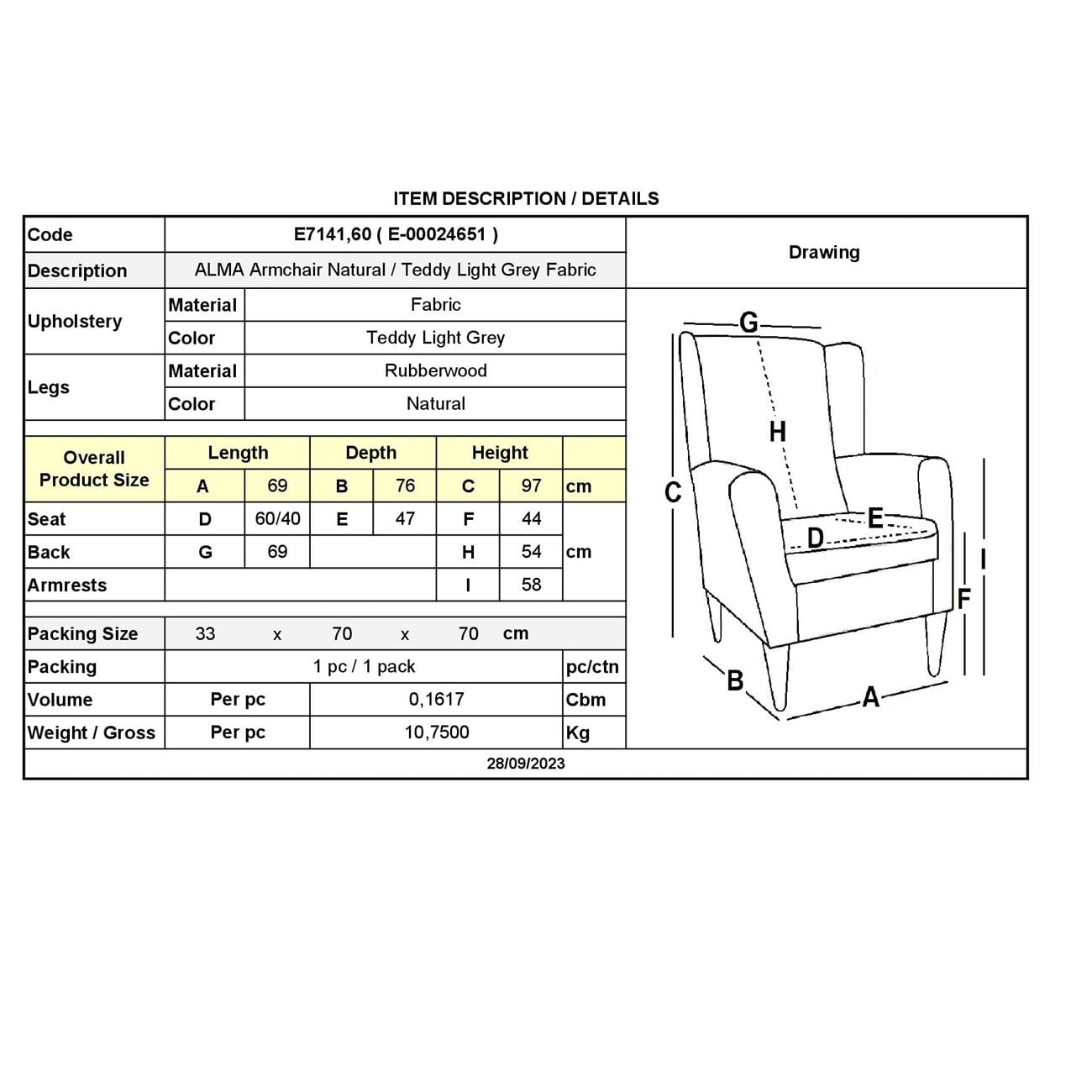 ALMA Πολυθρόνα - Μπερζέρα Σαλονιού - Καθιστικού Φυσικό, Teddy Ύφασμα Ανοιχτό Γκρι, K/D Ε-00024651 Ε7141,60