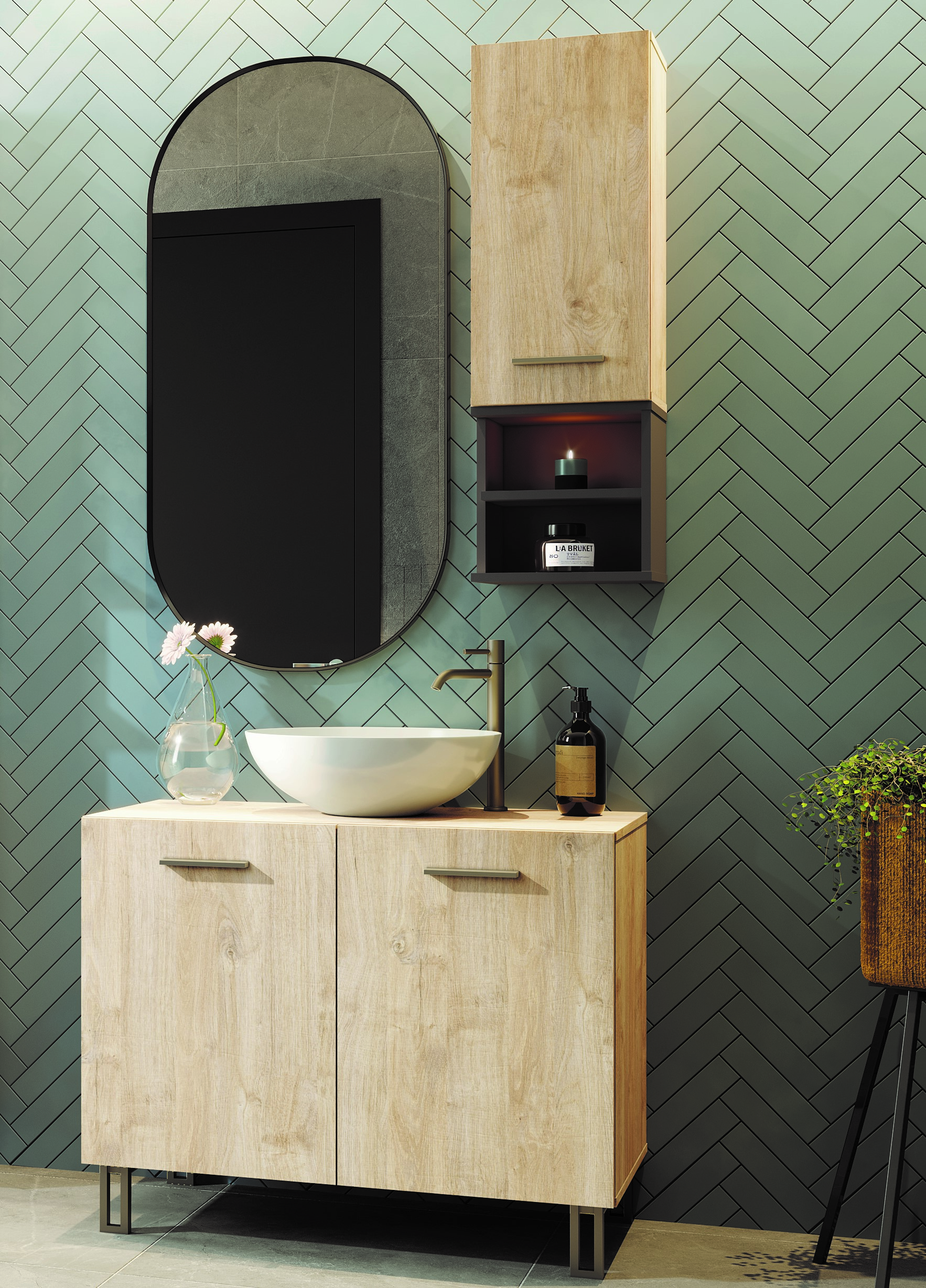 Έπιπλο νιπτήρα μπάνιου Dust με δύο πόρτες. Λιτή γραμμή για ιδανική και επαρκή αποθήκευση μπάνιου. Ενδείκνυται για επιτραπέζιο νιπτήρα. Το Grey Craft Oak είναι δυνατό και εκφραστικό ντεκόρ ξύλου. Διαθέτει μείγμα από μπεζ και γκρι αποχρώσεις και αυθεντική υφή με ορατές ρωγμές και ρόζους. Εκπέμπει χαρακτήρα με τις φυσικές ατέλειές του.