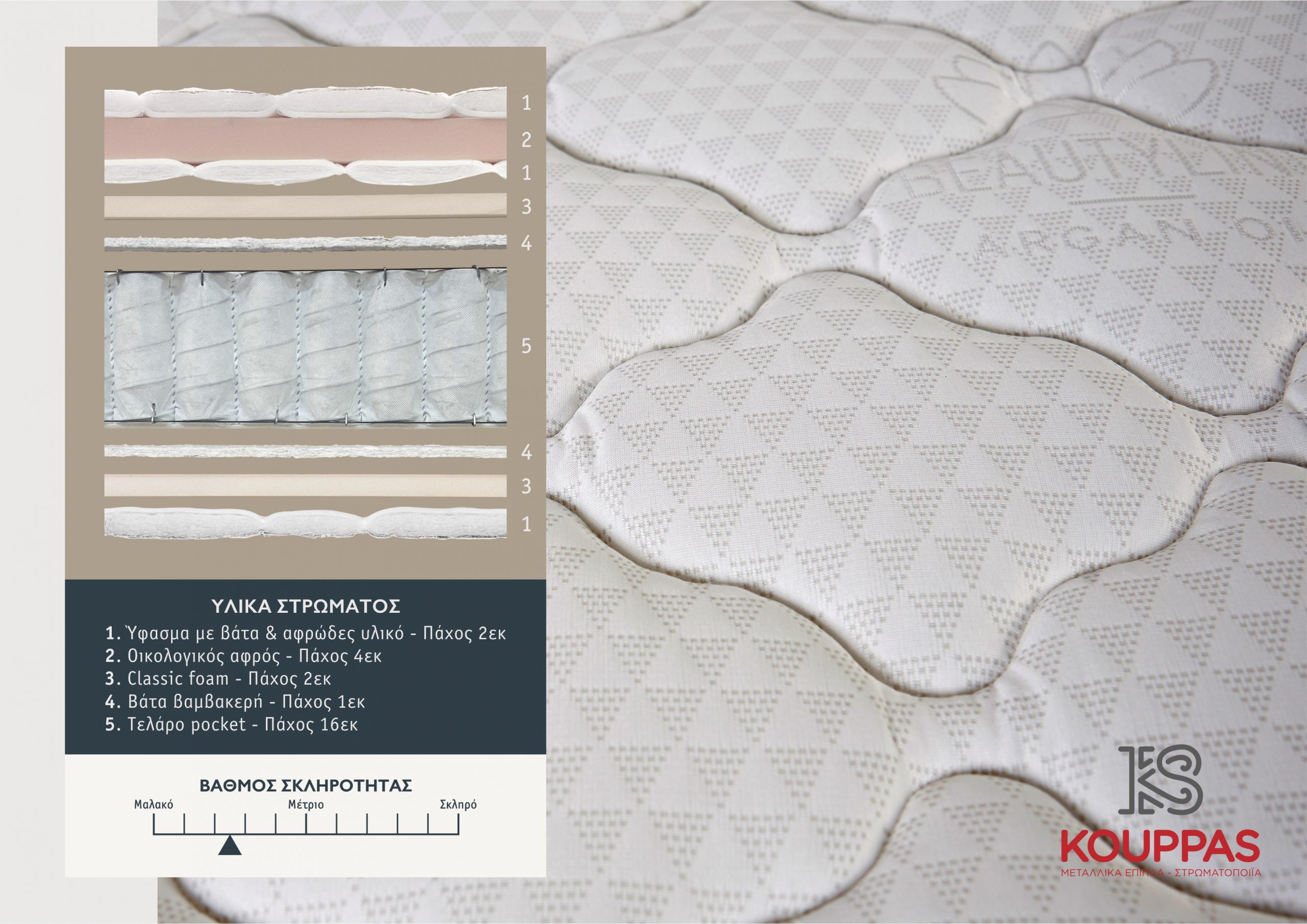Βαμβακερή βάτα και ενσωματωμένο ανώστρωμα, από αφρώδες υλικό εξαιρετικής αντοχής, που προάγει τη διατήρηση της ομοιομορφίας του στρώματος και συμβάλει στην ανάδειξη της ανατομικής του συμπεριφοράς.