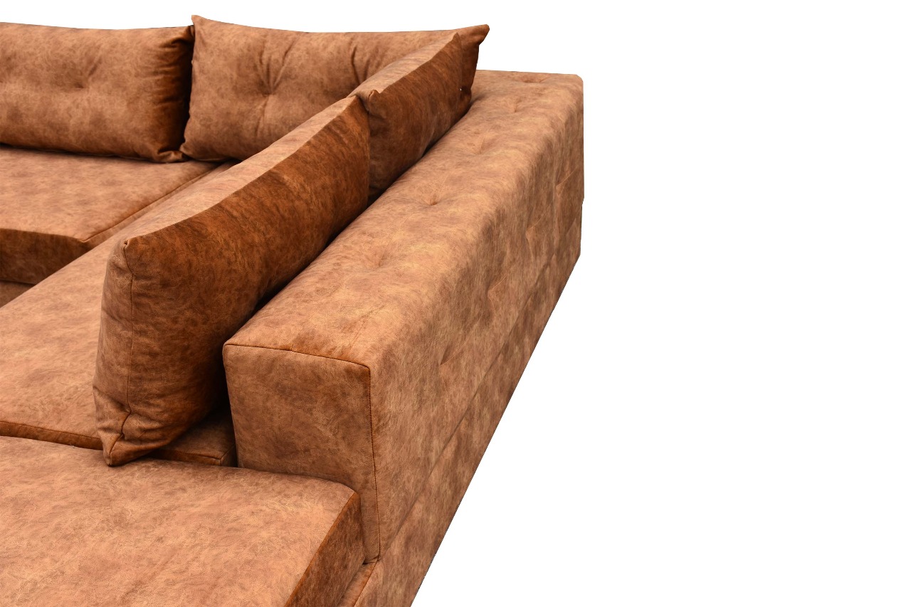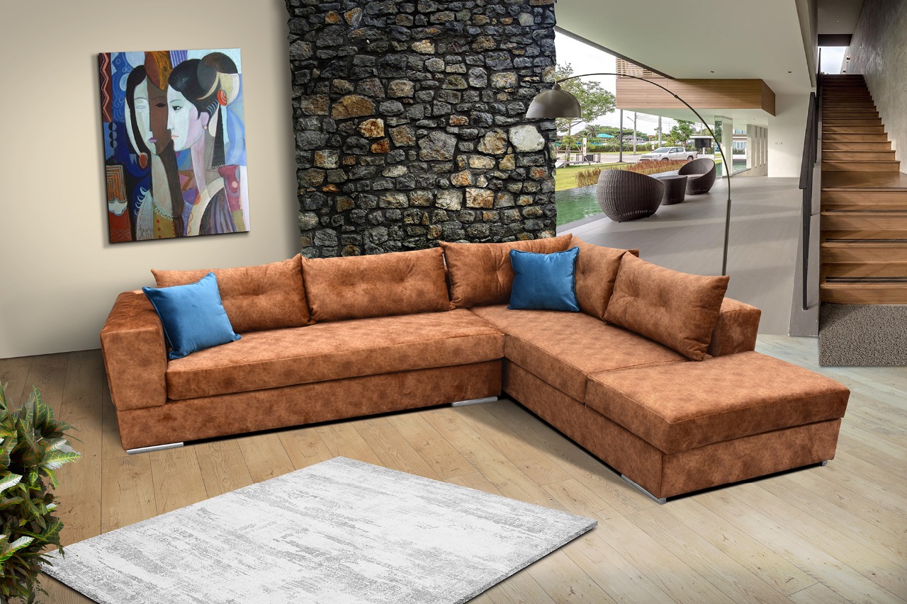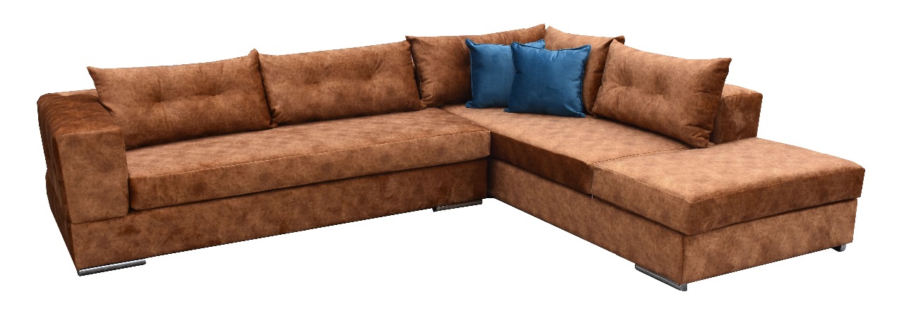 Γωνιακός καναπές, με τραβήγματα στο σκελετό και τα μαξιλάρια πλάτης. Το ύφασμα, τα χρώματα, οι διαστάσεις και η φορά του καναπέ, μπορούν να αλλάξουν ανάλογα με τις ανάγκες σας.