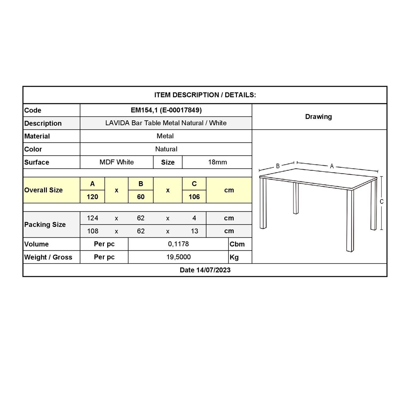 LAVIDA Τραπέζι BAR Μέταλλο Βαφή Φυσικό, Άσπρο MDF Ε-00017849 ΕΜ154,1