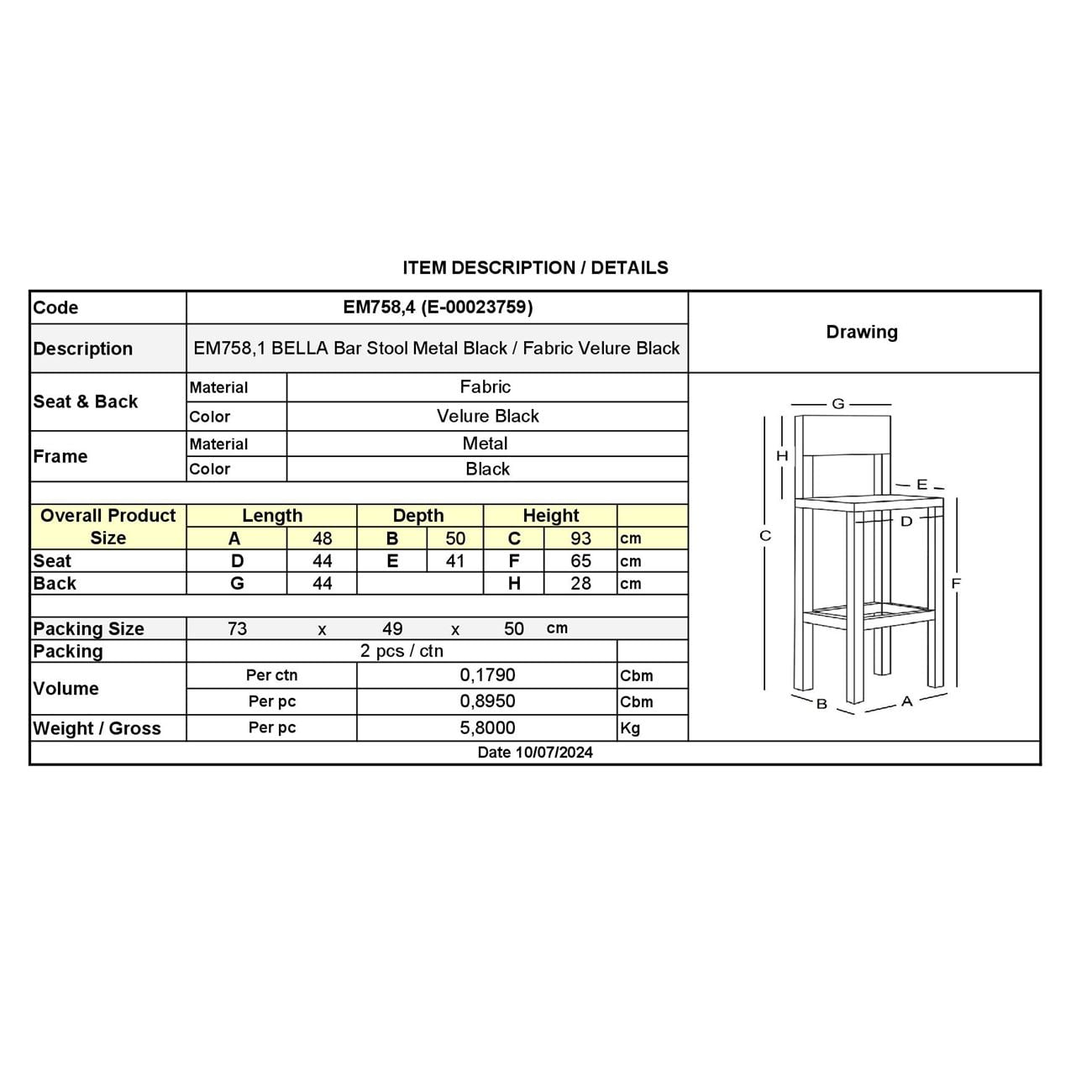 BELLA Σκαμπό BAR με Πλάτη, Μέταλλο Βαφή Μαύρο, Ύφασμα Velure Απόχρωση Μαύρο Ε-00023759 ΕΜ758,4 (ΣΕΤ ΤΩΝ 4)