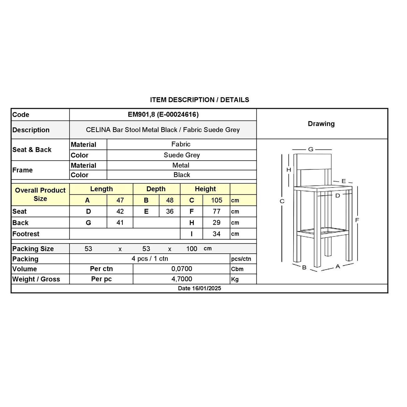 CELINA Σκαμπό BAR με Πλάτη, Μέταλλο Βαφή Μαύρο, Ύφασμα Suede Απόχρωση Γκρι Ε-00024616 ΕΜ901,8 (ΣΕΤ ΤΩΝ 4)